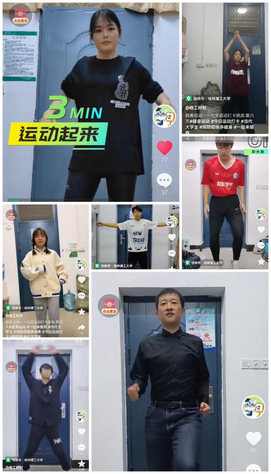 11月29日至12月5日,太阳集团城网站2017抖音账号“桂工材材”发起“疫”起运动——七天运动打卡挑战,2022级辅导员唐丹婷、桂鑫同5名2022级同学共同号召全体师生丰富室内活动,积极运动,强健体魄。