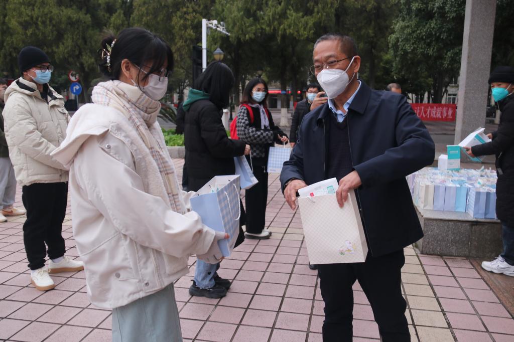 活动伊始,学院的领导老师为考研的学生代表送上学院精心准备的考研大礼包,礼包里面包含2个N95口罩、2颗棒棒糖、1瓶旺仔牛奶,1盒纯牛奶、1个士力架、一个柿子、一个橙子以及一张定制的明信片。柿子和橙子寓意着考研学子们能够心想“柿”“橙”,棒棒糖寓意着考研的学子们在考研期间身体棒棒,旺仔牛奶寓意着自信和一帆风顺,定制的明信片饱含着辅导员对考研同学的真切希望与美好祝福,发放N95口罩充分体现学院对同学们的关心关爱,以实际行动守护学生健康平安、安心暖心考研。学院领导在讲话中提到,希望同学们在考研冲刺的最后阶段能够坚定信念、增强信心、坚持到底、全力以赴、做好防护,以最佳的身心状态迎接考试的到来。