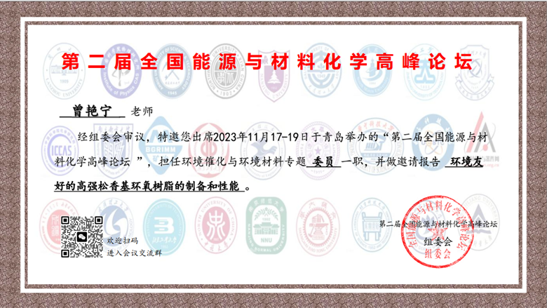 “2023第二届全国能源与材料化学高峰论坛”于2023年11月17日-19日在青岛召开。太阳集团城网站2017曾艳宁教授应邀参加此次会议并作了报告,报告题目为《环境友好的高强松香基环氧树脂的制备和性能》,报告结束后与参会专家进行了深入学术交流。