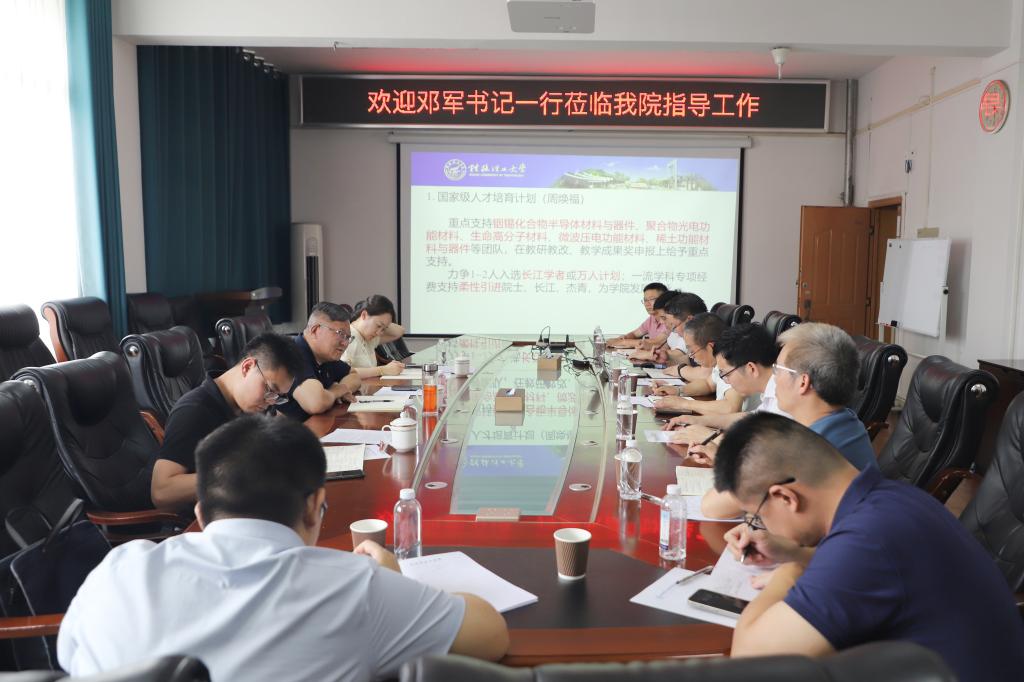 6月11日下午,学校党委书记邓军到学院就党建与思想政治教育、学科建设等工作进行专题调研。学校党办校办法务办相关负责人、工作人员陪同调研。学院全体班子成员参加调研座谈会。