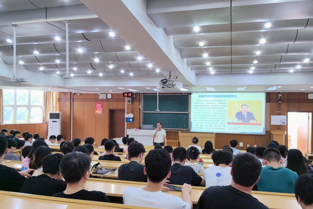 梁军同志围绕加强研究生学术诚信教育的重要意义、研究生学术诚信教育存在的主要问题、加强研究生学术诚信教育的途径与措施三个方面进行讲授。他指出,加强研究生学术诚信教育是提升研究生学术品质的内在要求、构建高校诚信学风建设的迫切需要和促进社会诚信建设的现实要求,培养优良学风,坚守学术规范,对于研究生成长成才具有长远的影响。