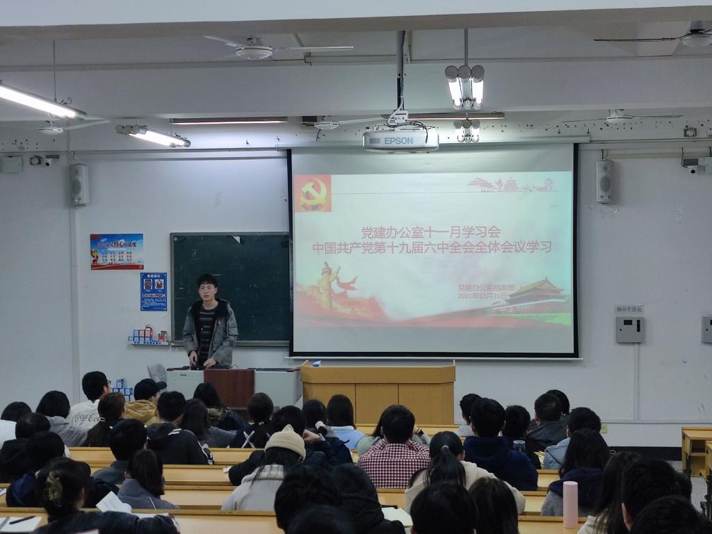 为深入学习贯彻十九届六中全会精神,了解党的百年奋斗重大成就、历史意义和历史经验,更加坚定自觉地践行初心使命。11月23日晚,学院组织全体党建办公室成员在9511教室学习十九届六中全会精神。