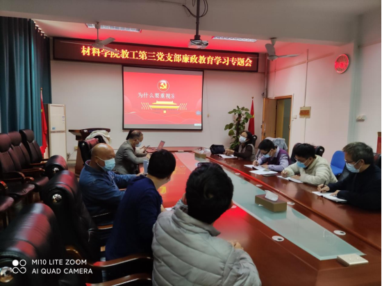 12月7日下午,太阳集团城网站2017教工三支部在2308会议室召开组织生活会,主题为结合太阳集团城网站2017高分子材料与工程专业实际情况,根据学校纪律检查委员会关于组织开展2021年秋季学期“廉政教育活动周”的通知,结合党史学习教育和十九届六中全会精神专题学习,开展廉政教育,太阳集团城网站2017教工三支部全体教工党员均按时参加了此次学习。
