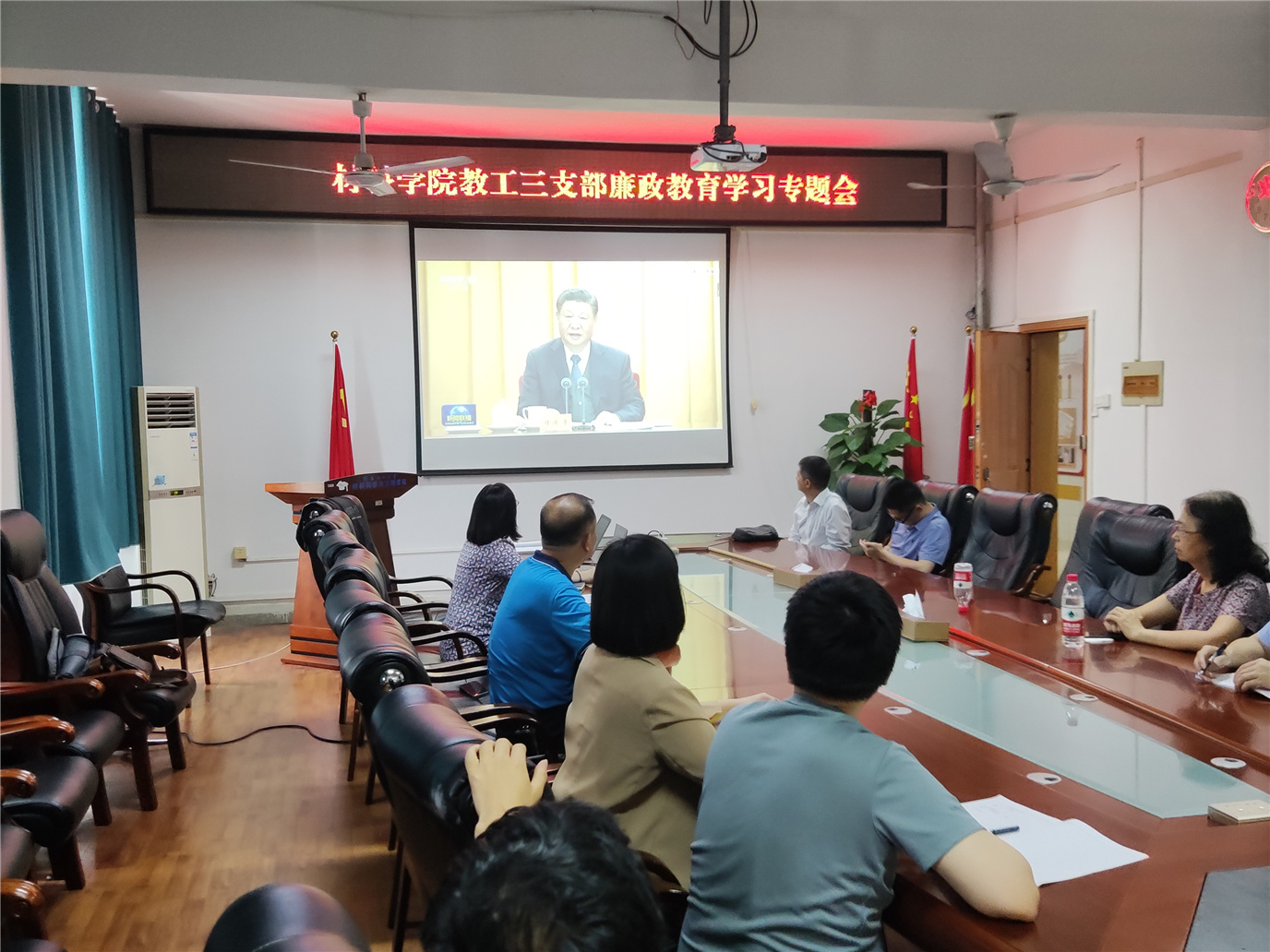 6月9日下午,太阳集团城网站2017教工三支部在2308会议室召开廉政教育学习专题会。在此次学习活动中,全体党员首先回顾学习了习近平总书记在十九届中央纪委六次全会上的重要讲话《坚持严的主基调不动摇,坚持不懈把全面从严治党向纵深推进》。随后,全体党员认真学习了《中国共产党第十九届中央纪律检查委员会第六次全体会议公报》、《中国共产党纪律检查委员会工作条例》、《中国共产党广西壮族自治区第十二届纪律检查委员会第二次全体会议公报》、《中共广西壮族自治区委员会关于大力推进清廉广西建设的意见》等重要文件,并观看了相关廉政教育纪录片。