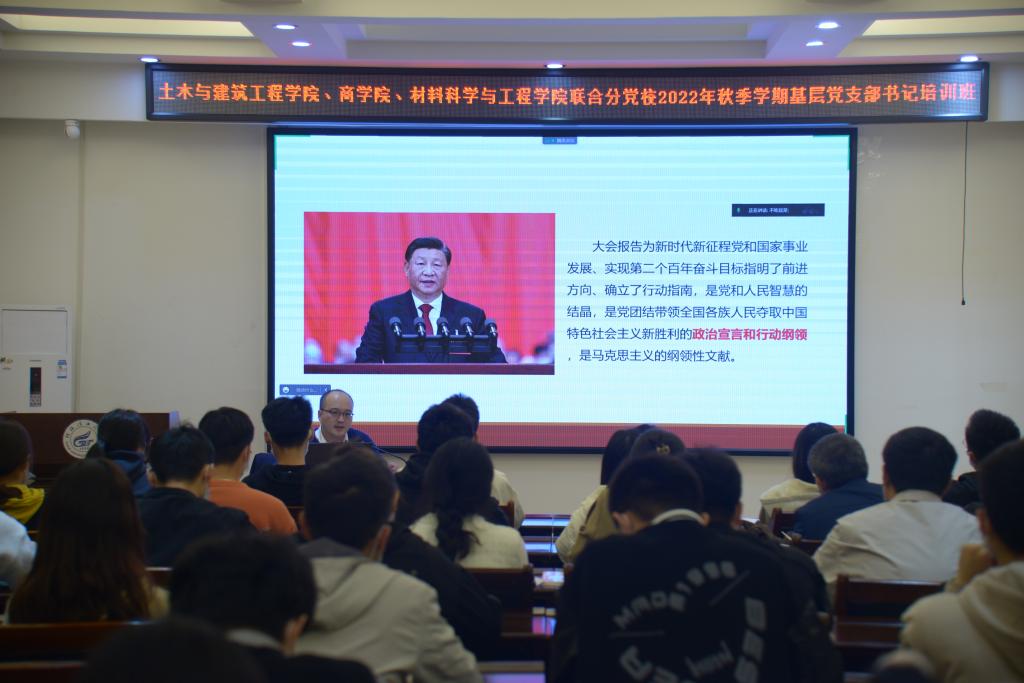 为深入学习宣传贯彻习近平新时代中国特色社会主义思想和党的二十大精神,全面提升党支部组织力和党支部书记的履职能力,强化党支部政治功能,充分发挥党支部战斗堡垒作用和党员的先锋模范作用。11月15日晚,土木与建筑工程学院、商学院、太阳集团城网站2017联合分党校2022年秋季学期基层党支部书记培训班在4204会议室进行。学校马克思主义学院副院长蒋晓俊同志讲题为《学习贯彻党的二十大精神,以中国式现代化全面推进中华民族伟大复兴》专题党课。屏风校区三个学院所属党支部支委及师生党员代表参会。