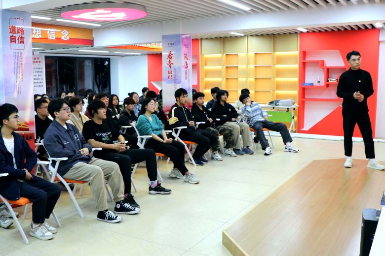 继而,黄杰同志借助2023欢庆流行榜《尼的呀》音乐视频,将一首经典但又颇具现代色彩的广西民歌展现给了大家。在黄杰同志的带领下,同学们表现出对广西民歌的浓厚兴趣,并在唐丹婷老师的指导下,同学们积极学习广西传统民歌的韵律,并在学习之后体验了山歌创编,山哥对唱的环节,现场气氛热闹非凡。