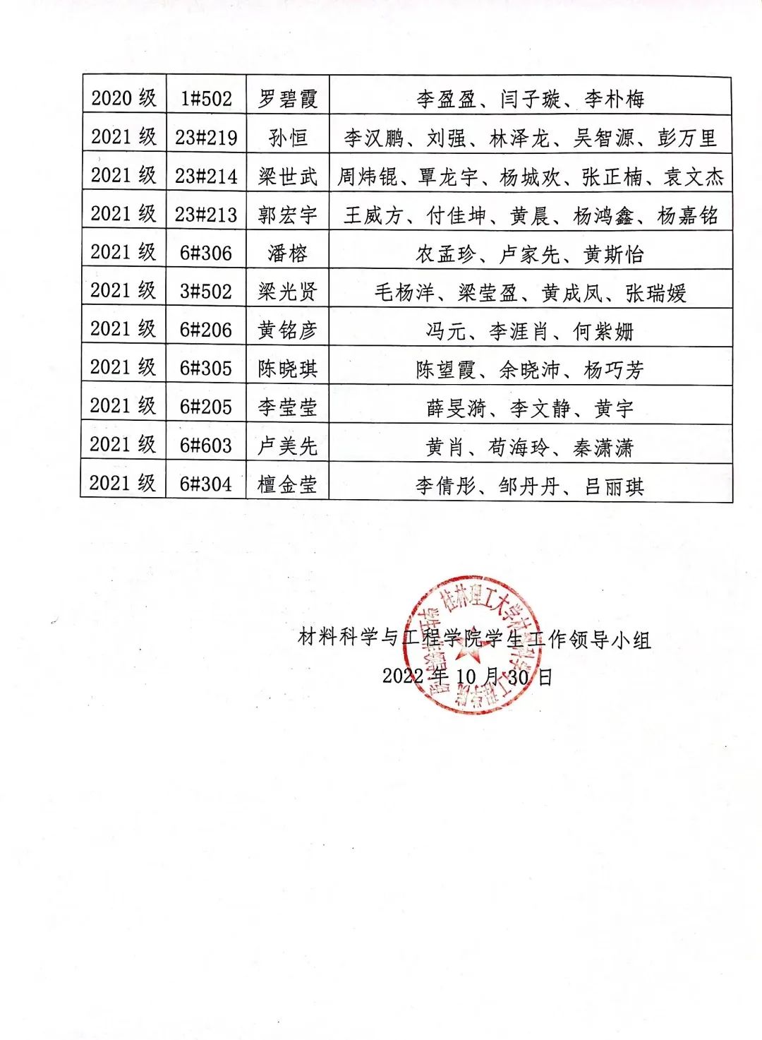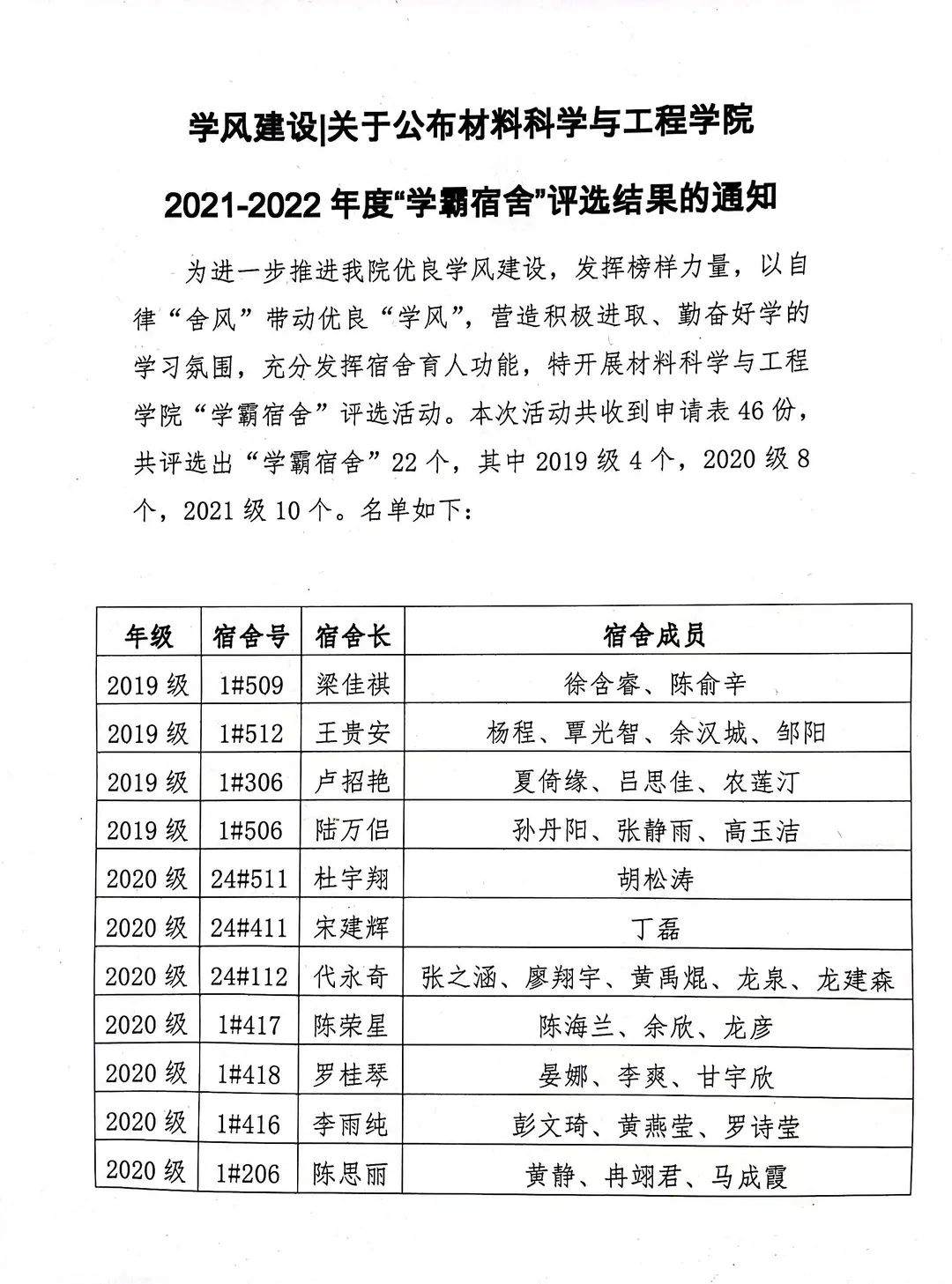 为进一步推进太阳集团城网站2017优良学风建设,发挥榜样力量,以自律“舍风”带动优良“学风”,营造积极进取、勤奋好学的学习氛围,充分发挥宿舍育人功能,特开展太阳集团城网站2017“学霸宿舍”评选活动。本次活动共收到申请表46份,共评选出“学霸宿舍”22个,其中2019级4个,2020级8个,2021级10个。名单如下: