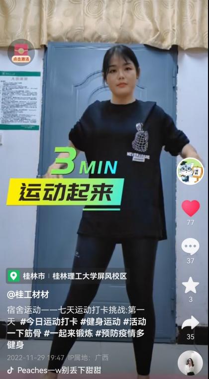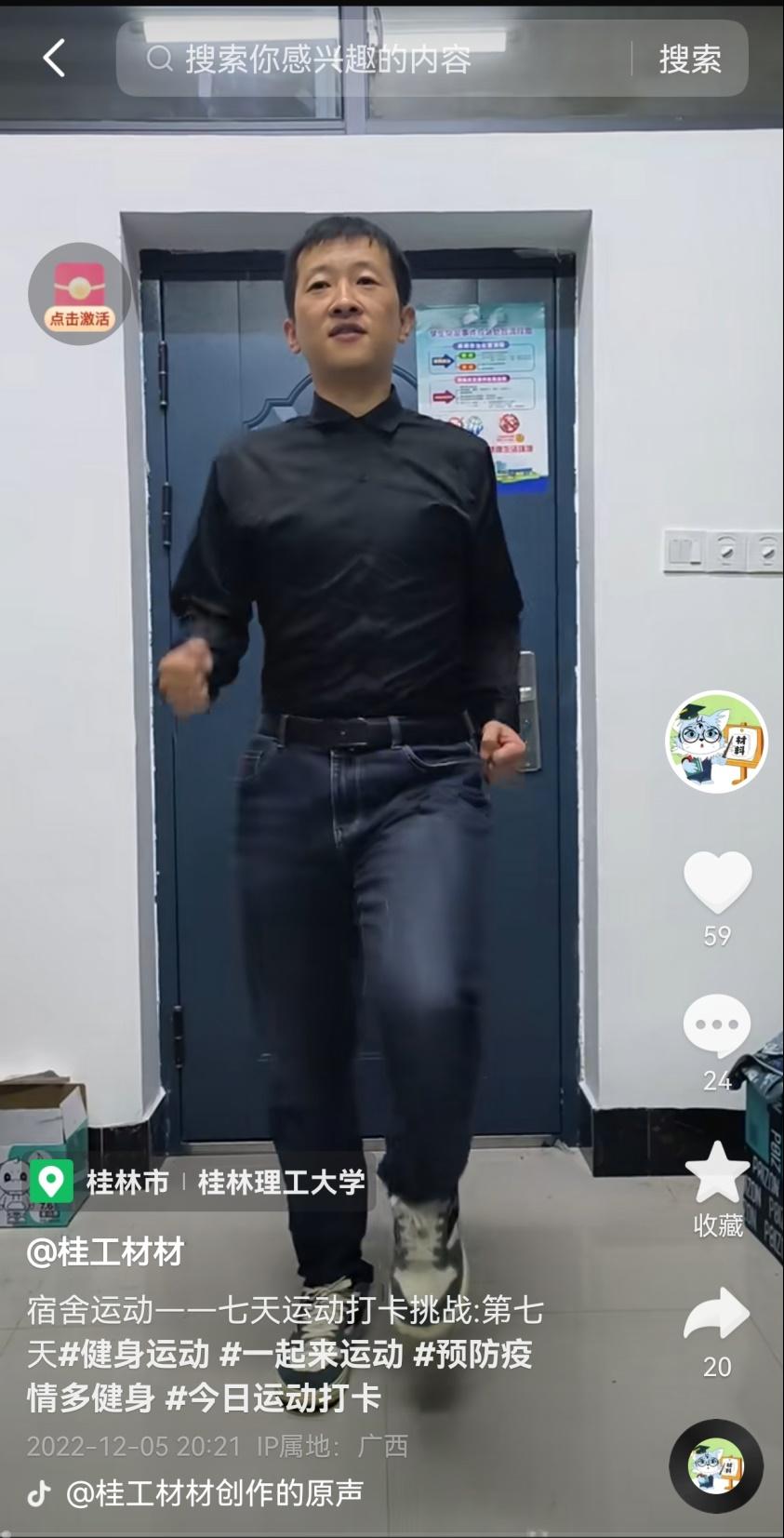 11月29日至12月5日,太阳集团城网站2017抖音账号“桂工材材”发起“疫”起运动——七天运动打卡挑战,2022级辅导员唐丹婷、桂鑫同5名2022级同学共同号召全体师生丰富室内活动,积极运动,强健体魄。