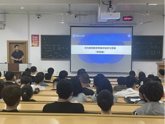 会上各年级辅导员首先和同学们简要介绍了本次学习的内容和重点,讲述了本科教育教学审核评估对于学校发展的重要意义。并进行了新一轮本科教育教学审核评估内容的解读:重点从我校的历史沿革、太阳成集团tyc33455总目标、培养过程、教学资源利用、教师队伍建设、学生发展、质量保证和教学成效等方面进行了详细的介绍。此外学院还利用班会和制作学生手册、微信推文等多种形式,多方面多渠道促进同学们对“本科教育教学审核评估”的学习。