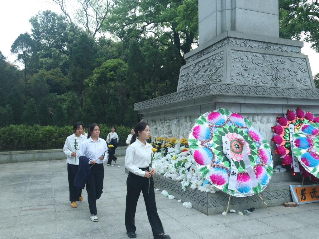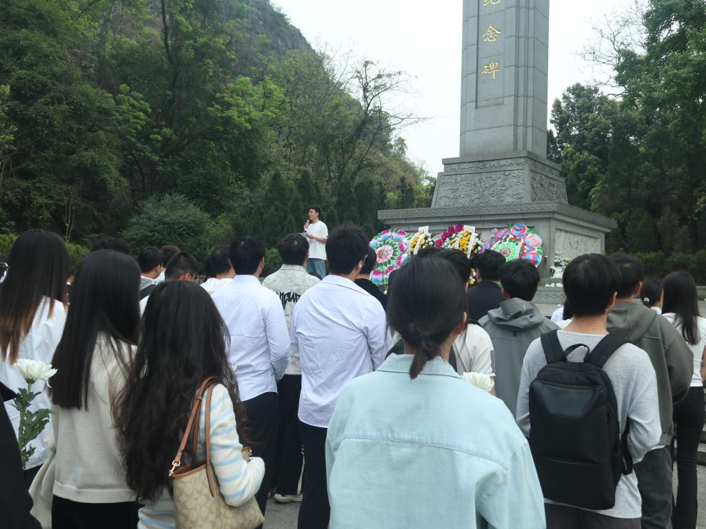 下午4时,全体师生整齐列队于烈士墓前。活动在嘹亮的国歌声中拉开序幕,师生肃立默哀,向烈士鞠躬致敬,并依次敬献白菊。一束束鲜花寄托着对革命先烈的深切哀思,也彰显了新时代青年传承红色精神的坚定信念。材料学院团委副书记在致辞中回顾了陈光烈士为民族解放事业英勇献身的事迹,强调“青年学子应以先烈为镜,将个人理想融入国家发展大局,在科技创新、乡村振兴等领域贡献青春力量”。